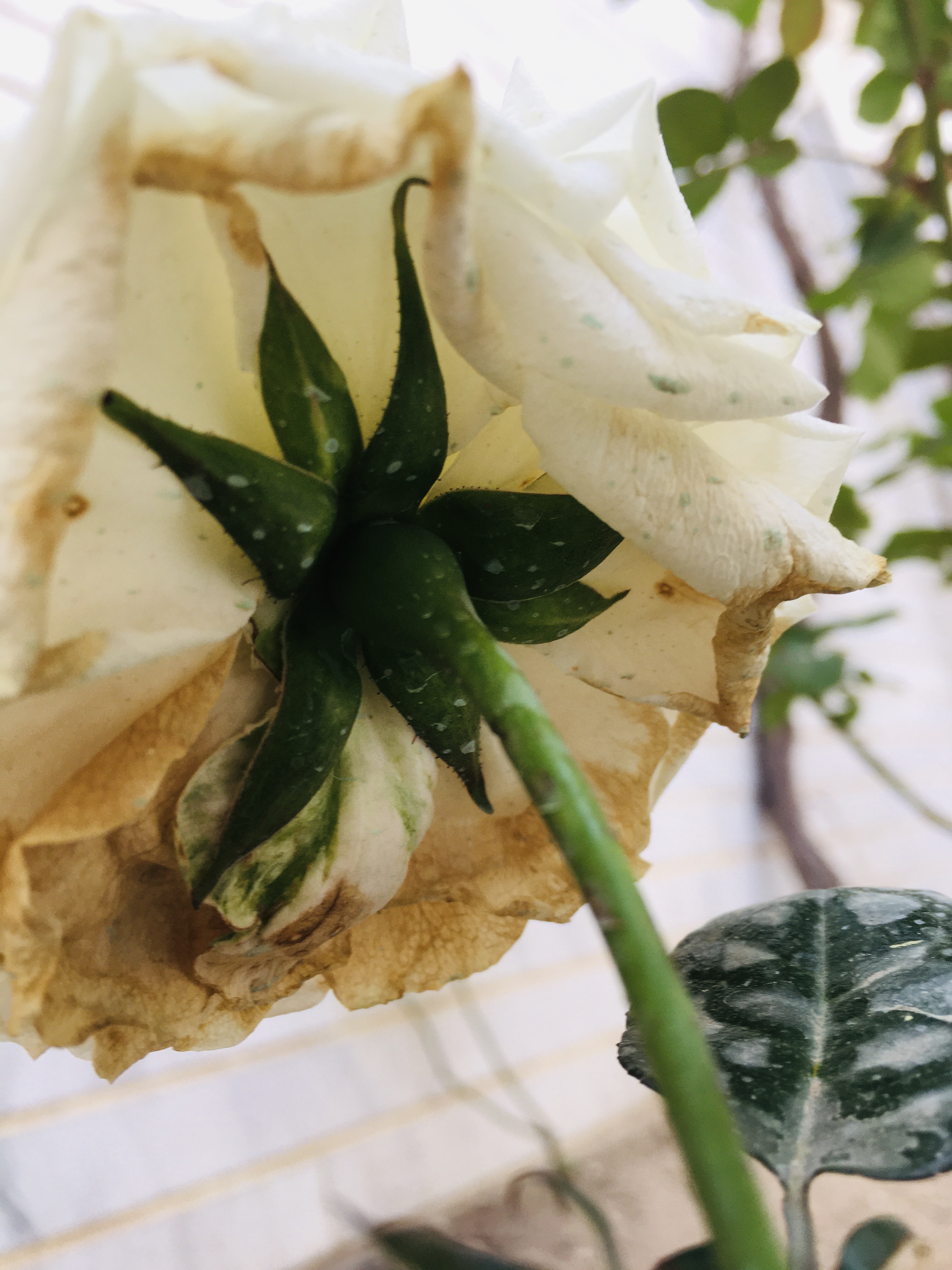 سلام، رز گیاه بیرونی هست داخل تراس نگهداری کنید برای محافظت از سرما میتونید کاور کنید ، از گیاه وقسمتهایی که میفرمایید تغییر رنگ دادند عکس واضح بفرستید تا بهتر راهنماییتون کنیم.